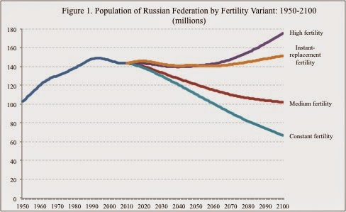 Tỉ suất sinh của Nga có thể tăng trong những thập niên tới. Tuy nhiên, thậm chí giả sử rằng nó tăng lên 1,9 ca sinh/1 phụ nữ cho đến cuối thế kỷ này – biến trung bình (the medium variant) – thì dân số Nga sẽ tiếp tục giảm còn 121 triệu người vào giữa thế kỷ này và 102 triệu vào cuối thế kỷ.
